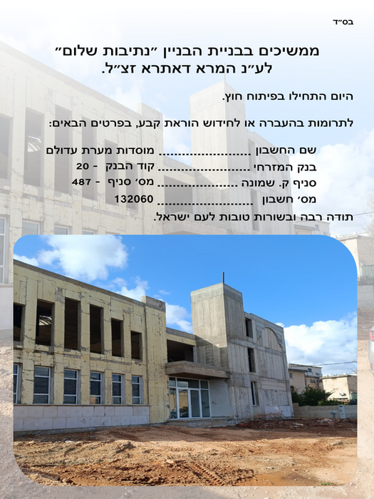 התפילות מתקיימות במקלט של מערת עדולם, מקלט מספר 402, רח' ריה"ל 24.